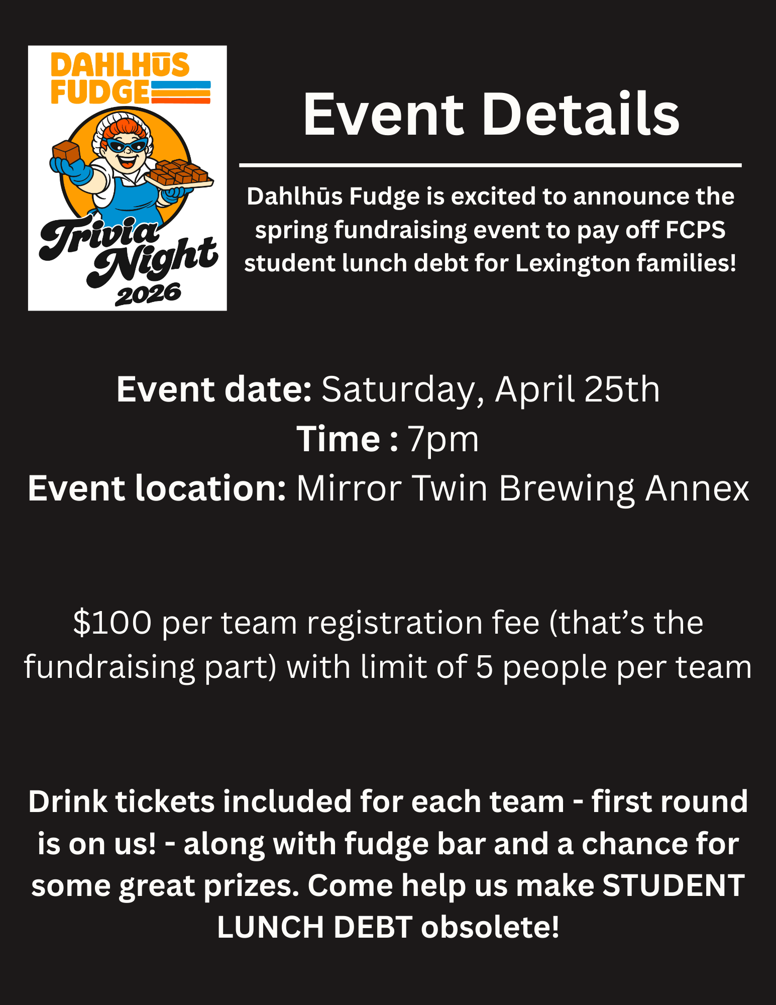 Expect amazing drinks, delicious fudge, and a night of fun helping us eliminate the lunch debt in Lexington!